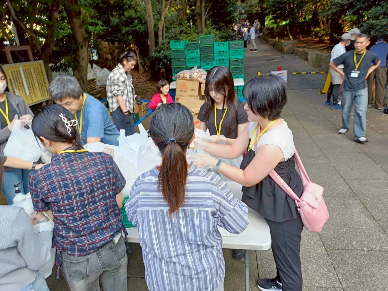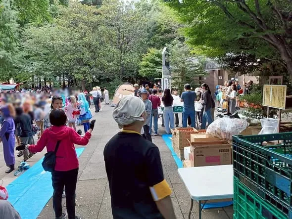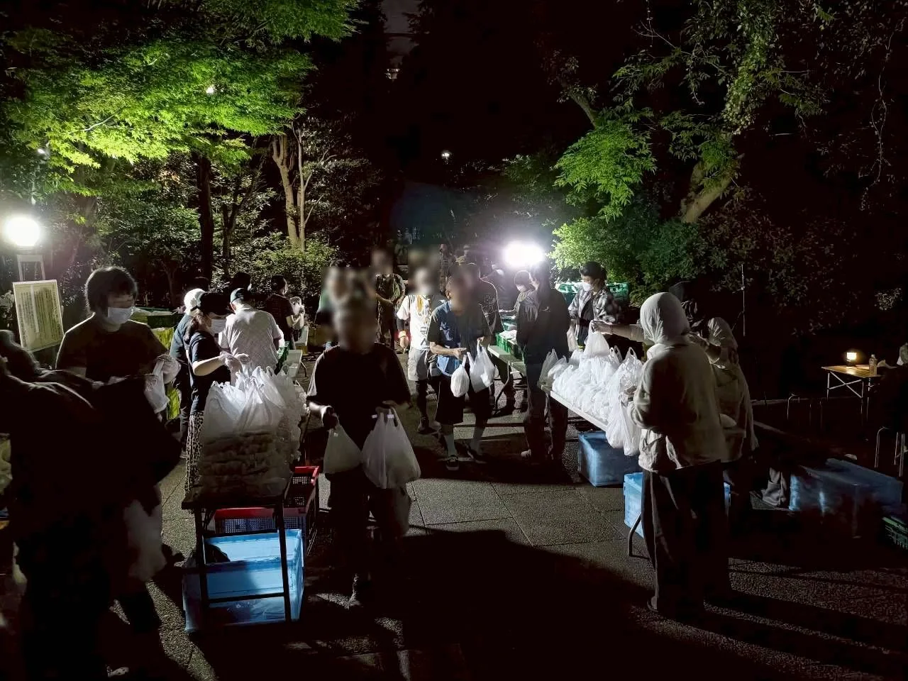 東池袋中央公園で炊き出しを行いました。606名とたくさんの方々が並ばれ、お弁当、パン、トマトなどをお配りしました。