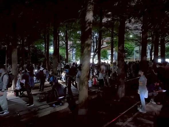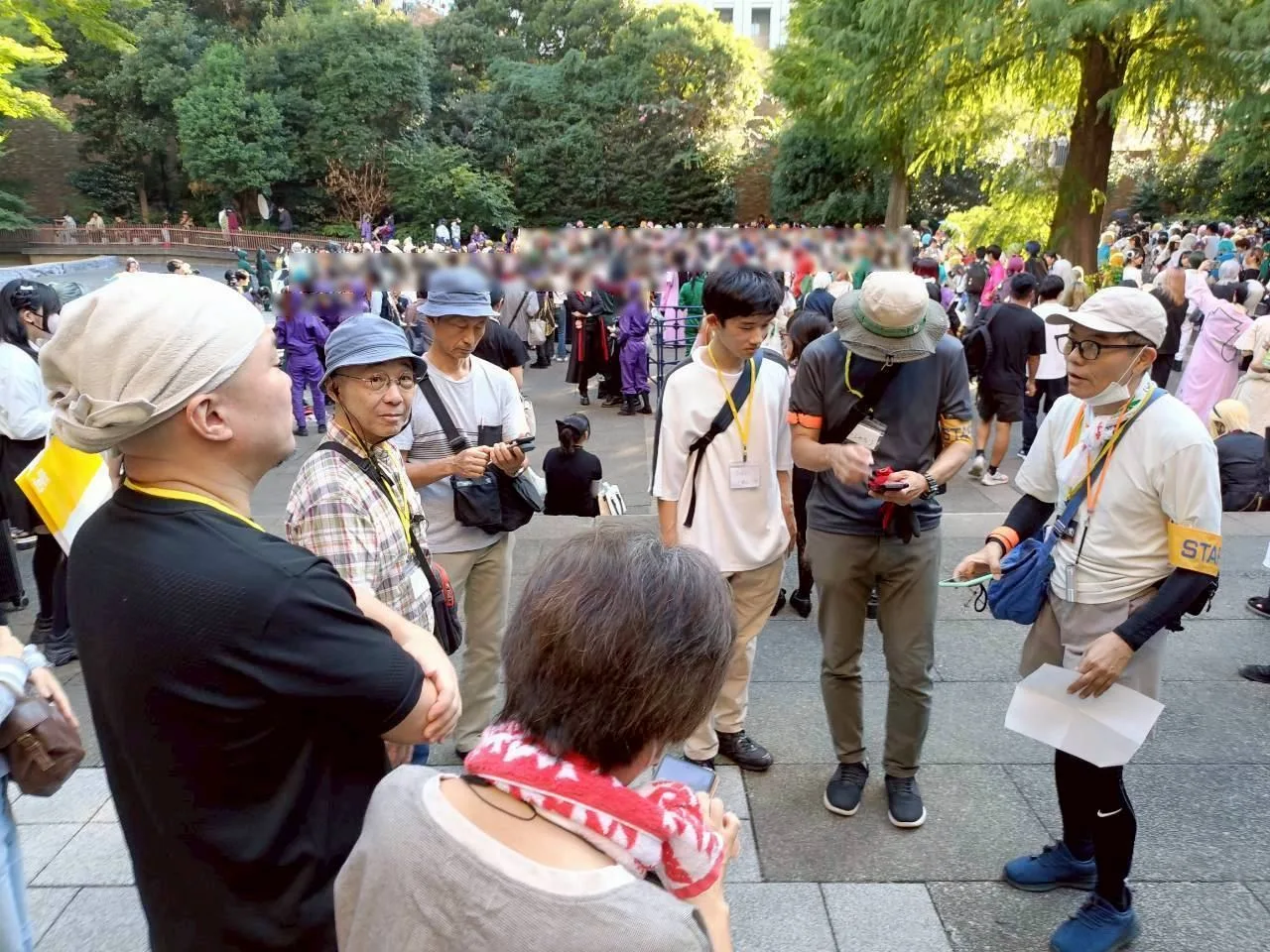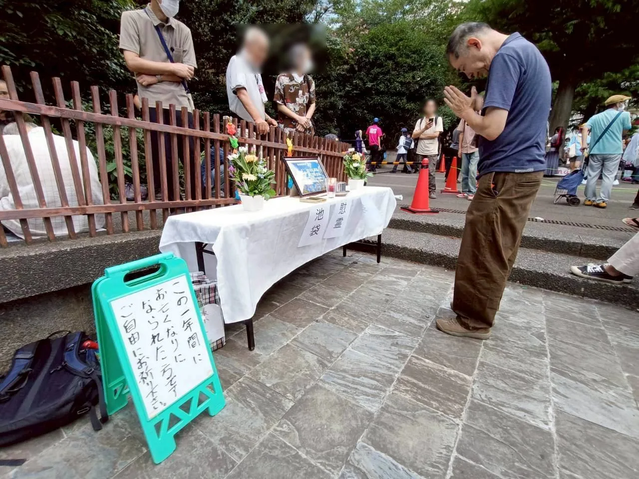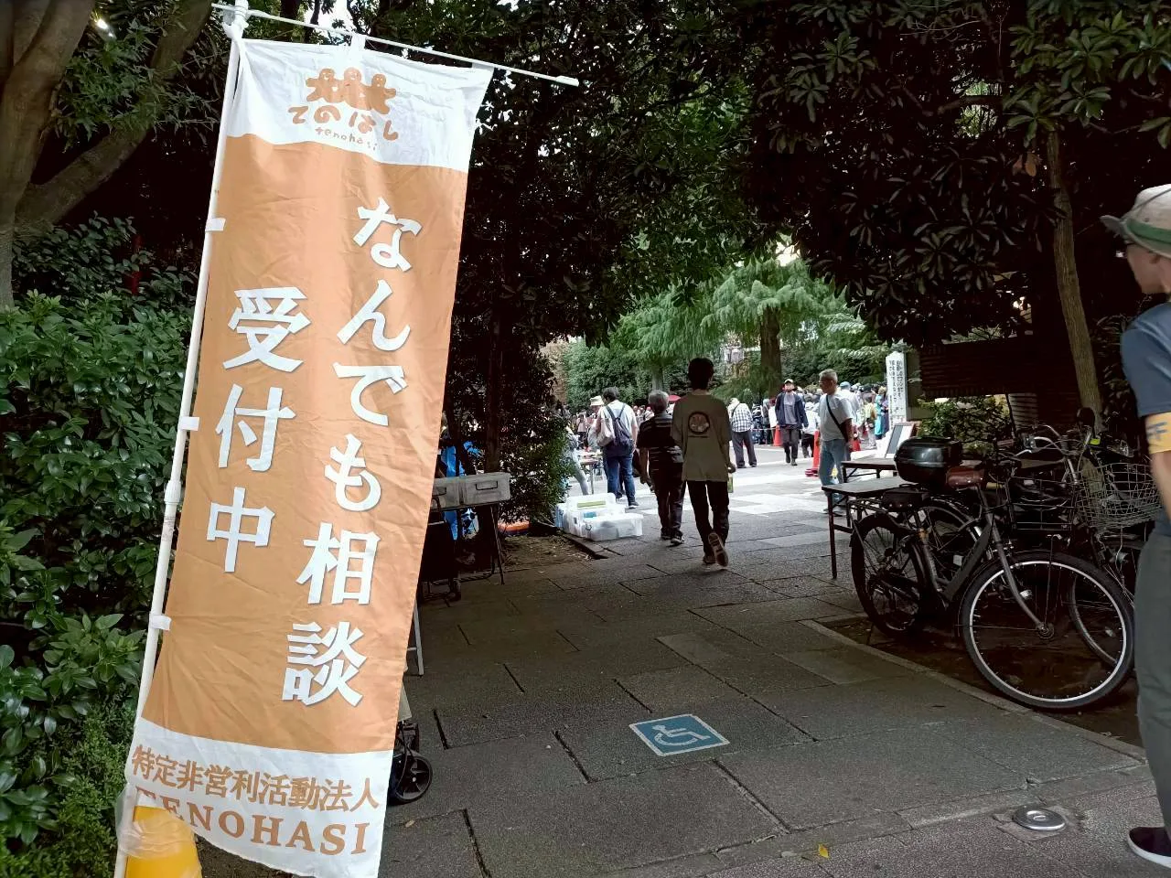 東池袋中央公園で炊き出しを行いました。606名とたくさんの方々が並ばれ、お弁当、パン、トマトなどをお配りしました。